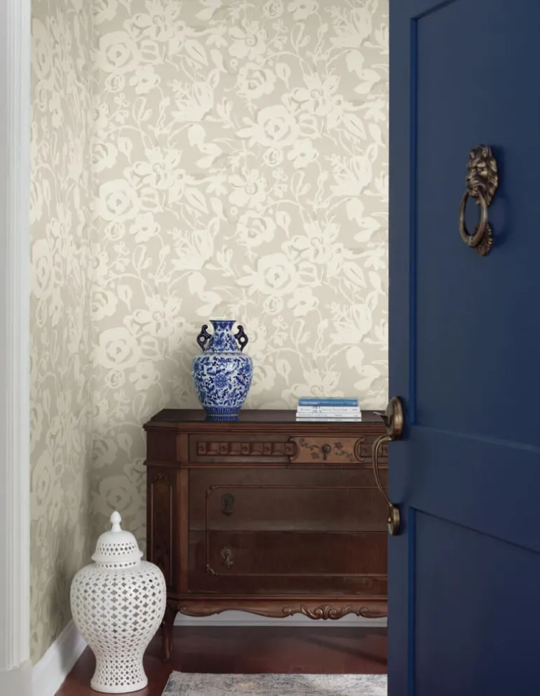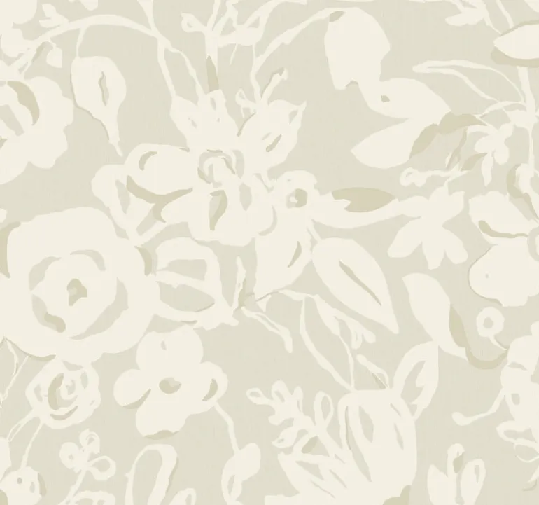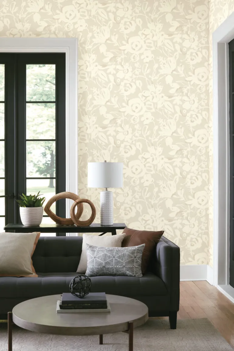 Abstract flowers are artistically rendered in a restrained color palette in pattern Brushstroke Floral featured in beige and off white. This Brushstroke Floral Wallpaper measures approximately 27 inches wide by 27 feet long, measuring approximately 60.8 square feet per roll. Florals speak the language of ever-evolving style with instant connection and iconic form that confidently compliments any space and every design signature.