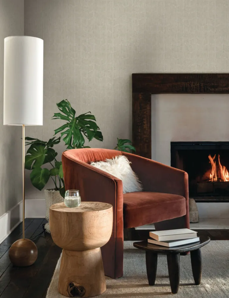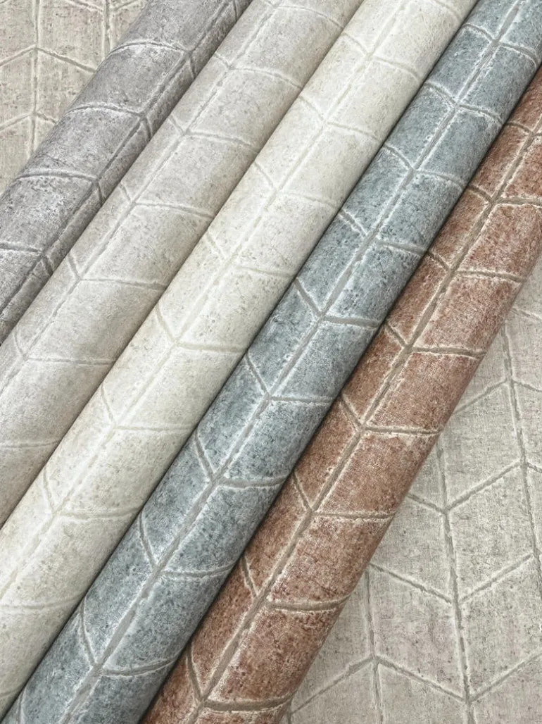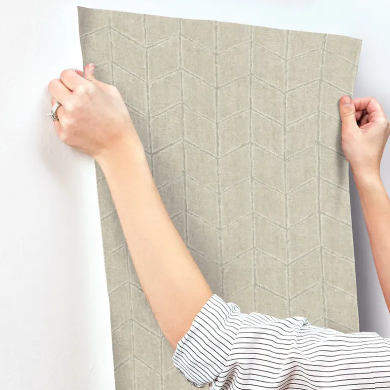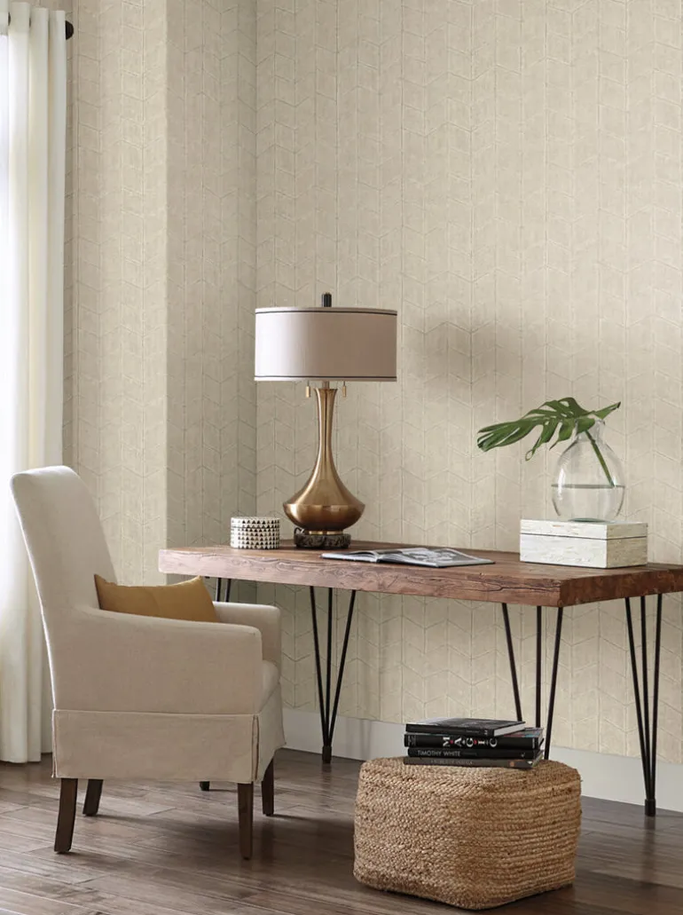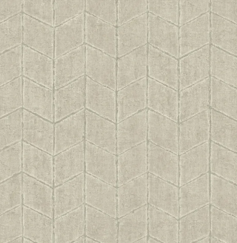 The chevron gets a modern, industrial upgrade when stylized with raised textural plaster relief and metallic in the pattern Flatiron Geometric, shown in taupe brown with gray. This Flatiron Geometric Wallpaper measures approximately 20.5 inches wide by 33 feet long, measuring approximately 56.4 square feet per roll. The modern aesthetic of natural form.