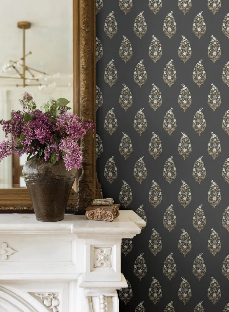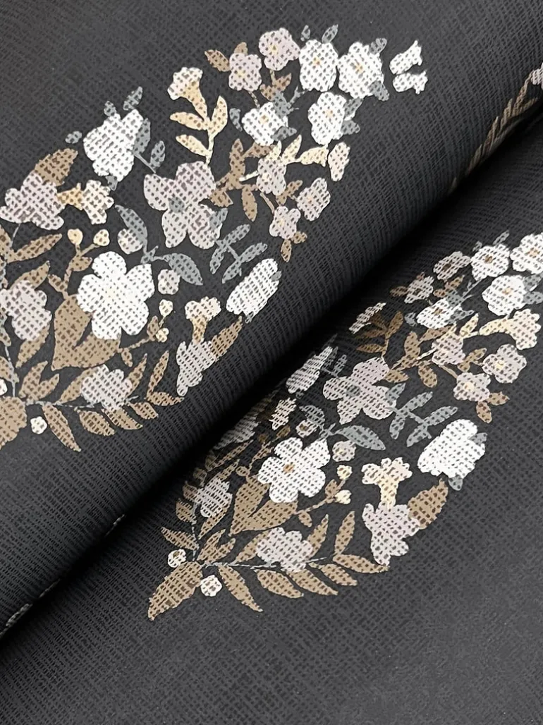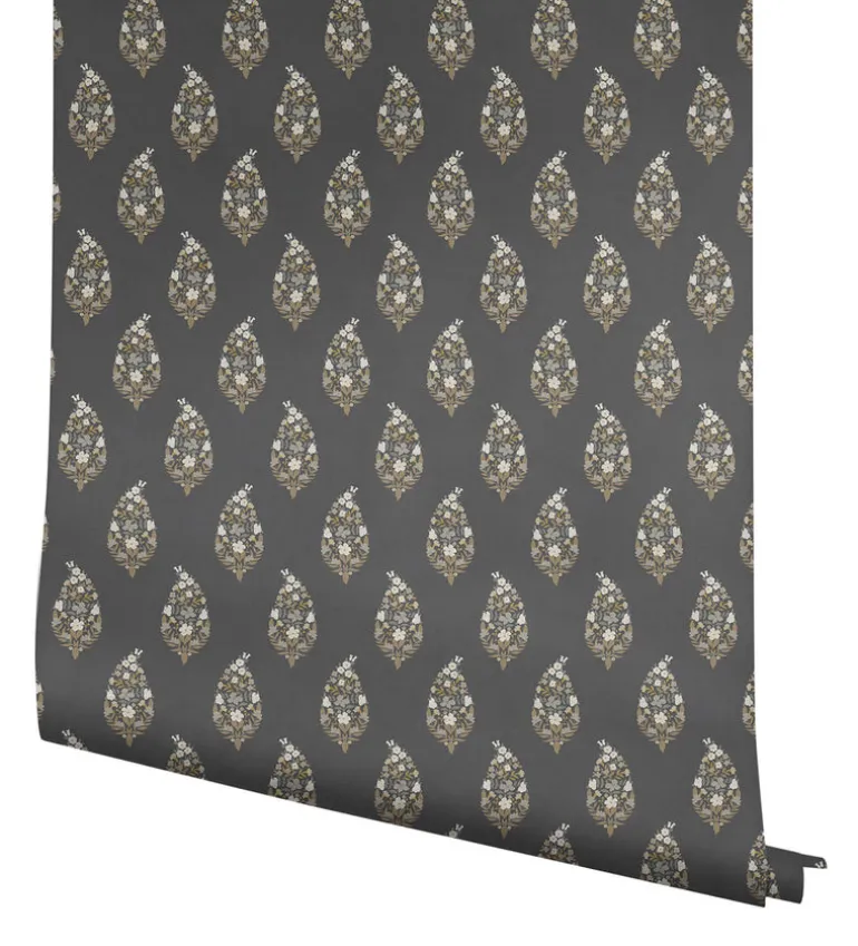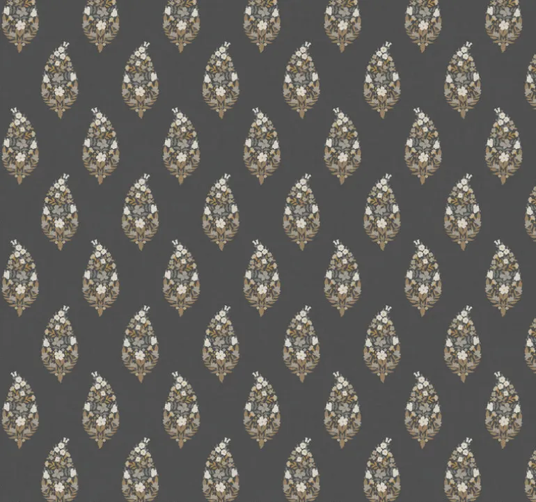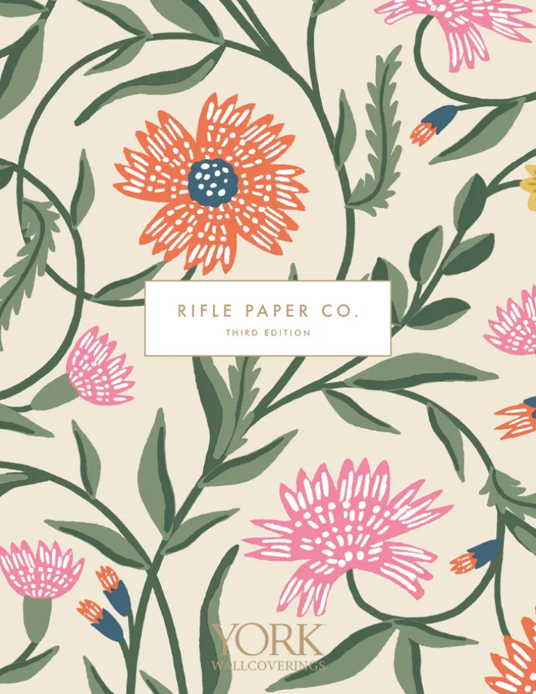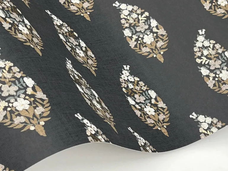 Small flowers and leaves create ornamental teardrop shapes on our fresh take on a traditional Paisley print. Illustrated in shades of white, grey, steel blue, ochre, and charcoal. This Paisley Wallpaper measures approximately 27 inches wide by 27 feet long, measuring approximately 60.8 square feet per roll. The world of Rifle Paper Co. is in full bloom with their third wallpaper collection. With statement floral prints, detailed illustrated designs, and metallic accents, this collection is designed to bring beauty to every room.