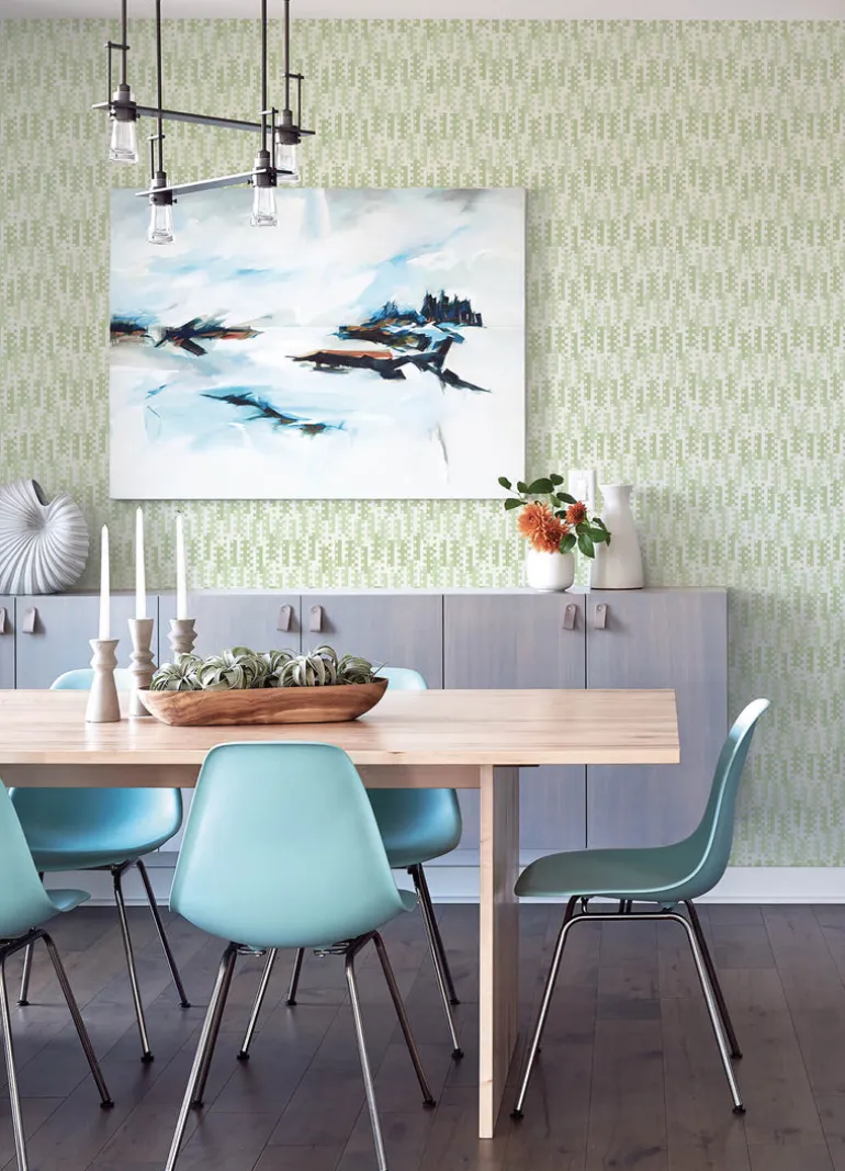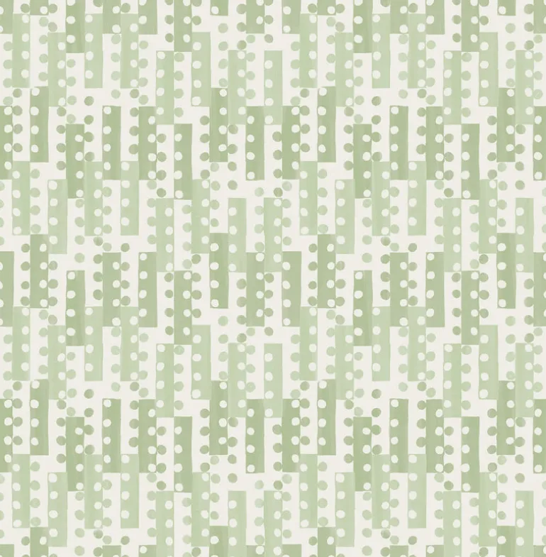 Enjoy Scandinavian simplicity with a playful twist with this playful geometric wallpaper. The thin rectangular blocks are trimmed with circular accents, the shapes inked in two shades of light green along a white background. Erik is an unpasted, non woven wallpaper.