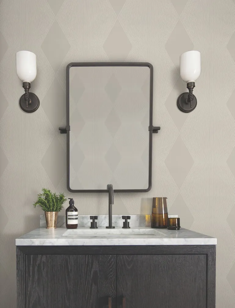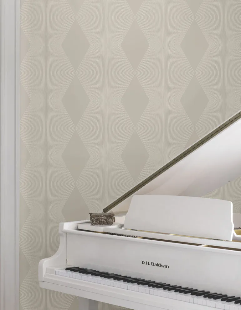 Diamond Legacy's dramatic geometric columns garner added depth from tactile, raised ink detailing. Featured here inked in cream and pale grey against a taupe ground. This Diamond Legacy Wallpaper measures approximately 27 inches wide by 27 feet long, measuring approximately 60.8 square feet per roll. Traditional and timeless meets modern refinement, with artfully crafted designs redefined in striking color palettes.