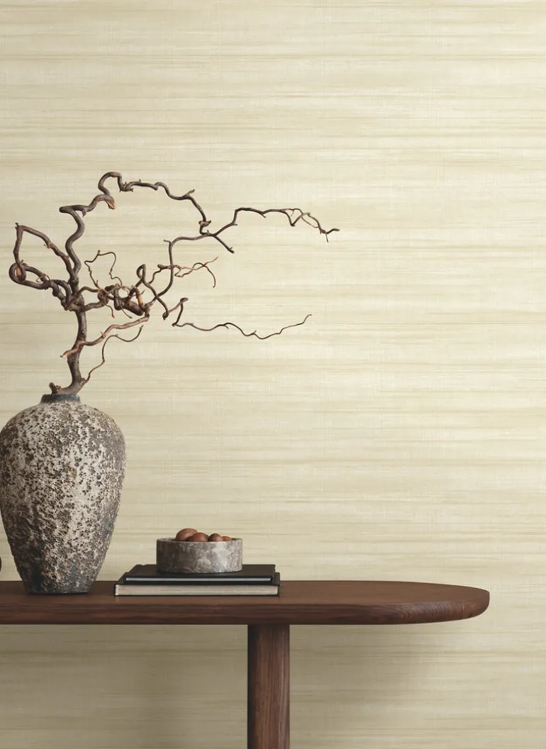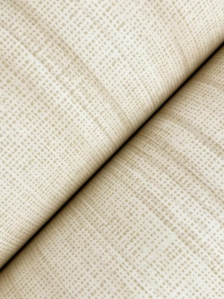 Horizontal brushstrokes of diffused color paint a Brushed Linen canvas with the essence of authentic handpainted design, shown in ivory off-white with neutral beige touches. This Brushed Linen Wallpaper measures approximately 27 inches wide by 27 feet long, measuring approximately 60.8 square feet per roll. The distinction of timeless style.