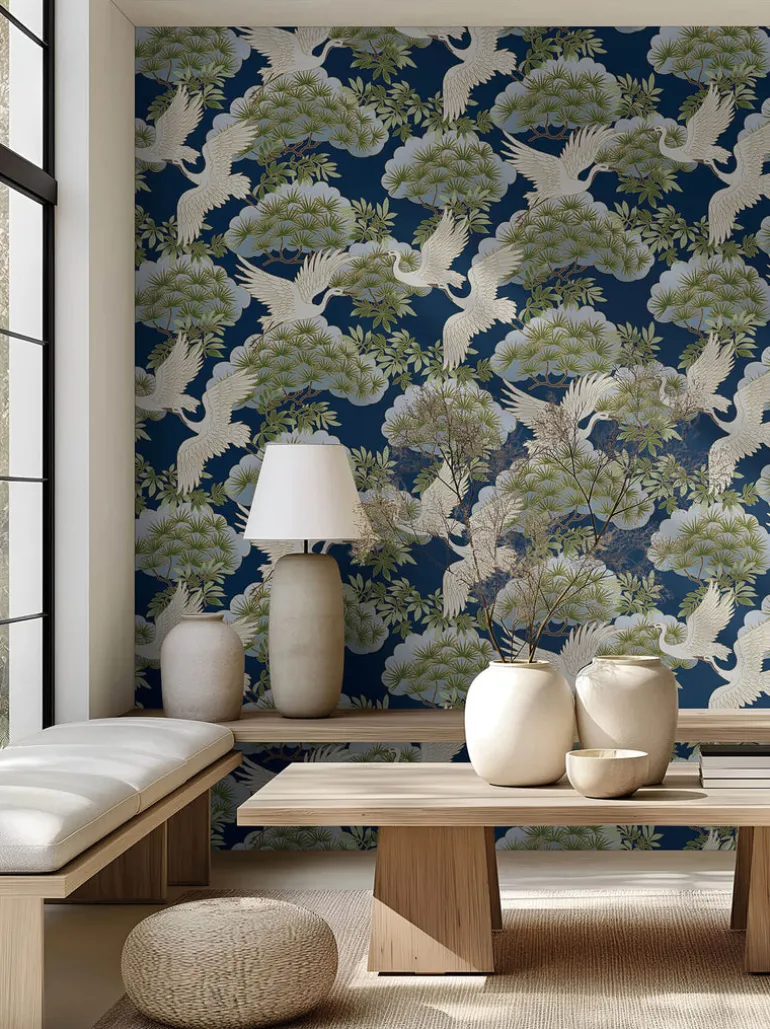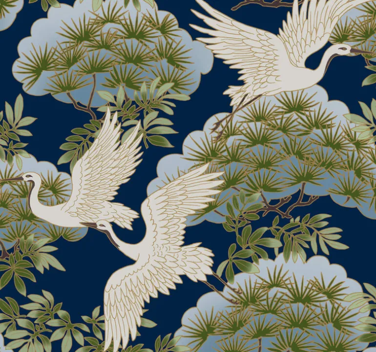 Sprig & Heron’s graceful birds lift their lustrous wings as they fly between beautiful, stylized bonsai trees, shown here in navy and greens with gold metallic. This Sprig & Heron Wallpaper measures approximately 27 inches wide by 27 feet long, measuring approximately 60.8 square feet per roll. The tea garden provides a meditative pathway from the outside world to inner tranquility. Experience the quiet luxury and uncompromising beauty within this second edition Tea Garden collection.