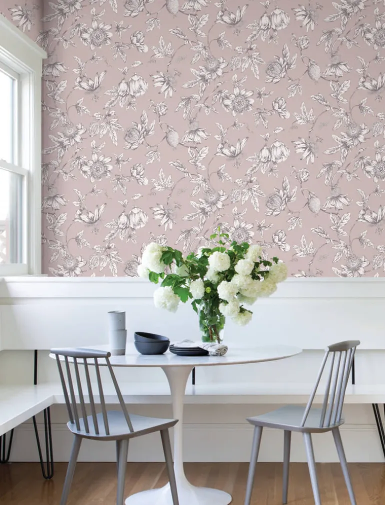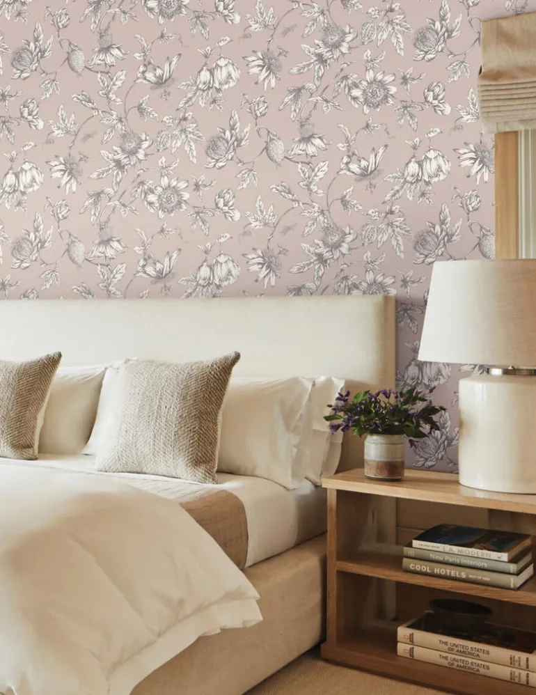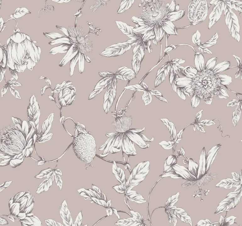 Meandering vines supporting impressive tropical blooms are illustrated in muted plum and white against a pale orchid backdrop. This Passion Flower Toile Wallpaper measures approximately 27 inches wide by 27 feet long, measuring approximately 60.8 square feet per roll. The quintessential design for timeless romance, toile (pronounced ‘twall’) traces its origins to 18th century fabrics. This celebrated motif is explored with a range of classical reproductions and modern reimaginings.